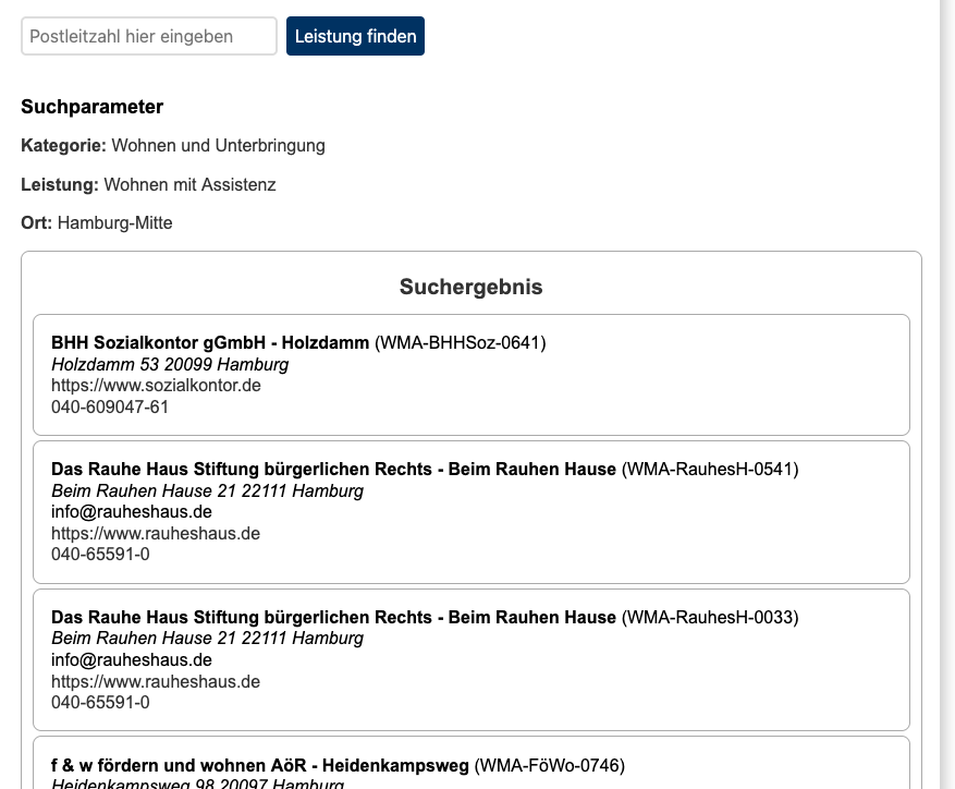 Nach der Suche wird eine Liste mit Anbietern und Einrichtungen angezeigt, die zu Ihrer Auswahl passen. Hier finden Sie Namen, Adressen, Kontaktdaten und oft auch eine Webseite oder E-Mail-Adresse, über die Sie weitere Informationen bekommen können.