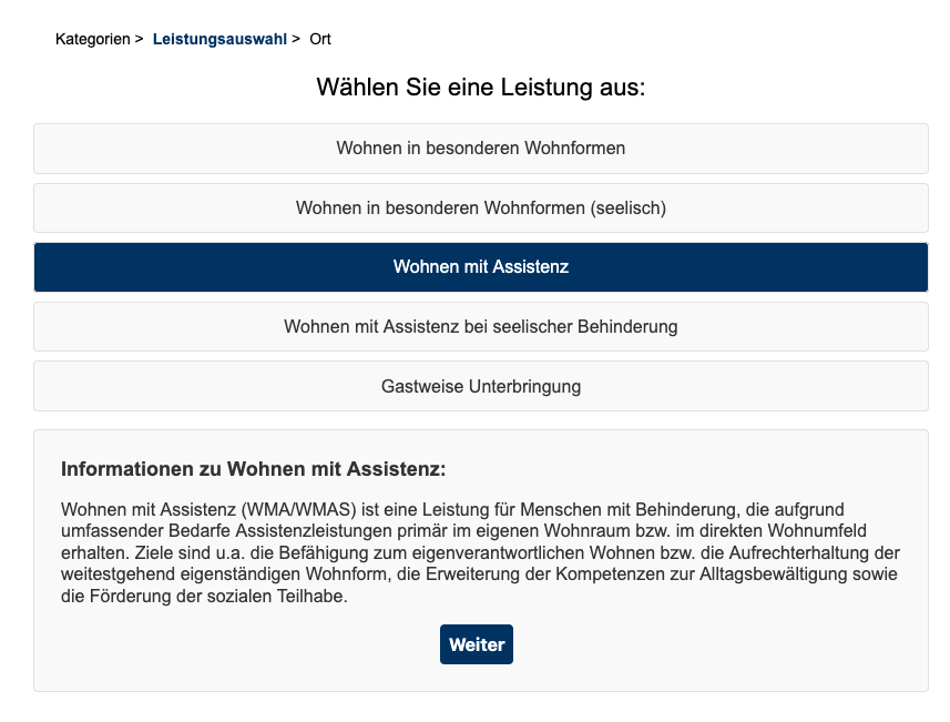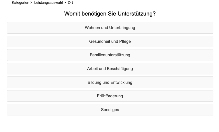 Zunächst geht es darum, in welchem Bereich Sie Unterstützung benötigen. Es gibt verschiedene Kategorien, wie z. B. Wohnen und Unterbringung, Gesundheit und Pflege, Familienunterstützung oder Bildung und Entwicklung. Einfach die passende Kategorie anklicken.