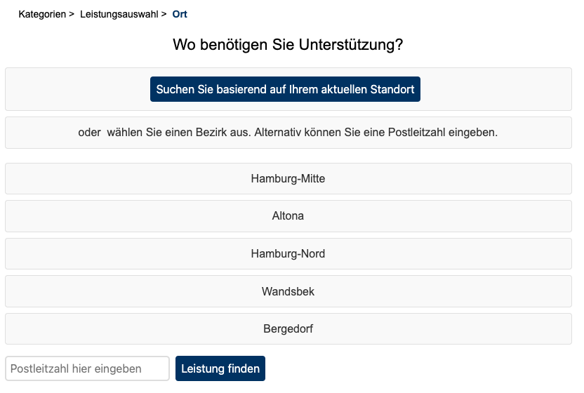 Nachdem Sie eine Kategorie gewählt haben, erscheint eine Liste mit konkreten Unterstützungsangeboten. Wählen Sie das aus, was am besten zu Ihrer Situation passt. Falls Sie sich unsicher sind, hilft Ihnen eine kurze Beschreibung der Leistungen weiter.