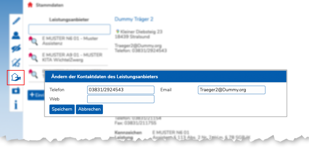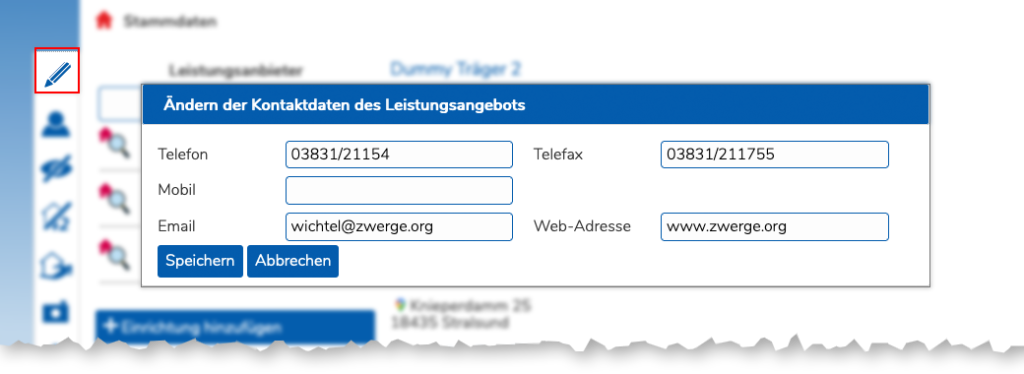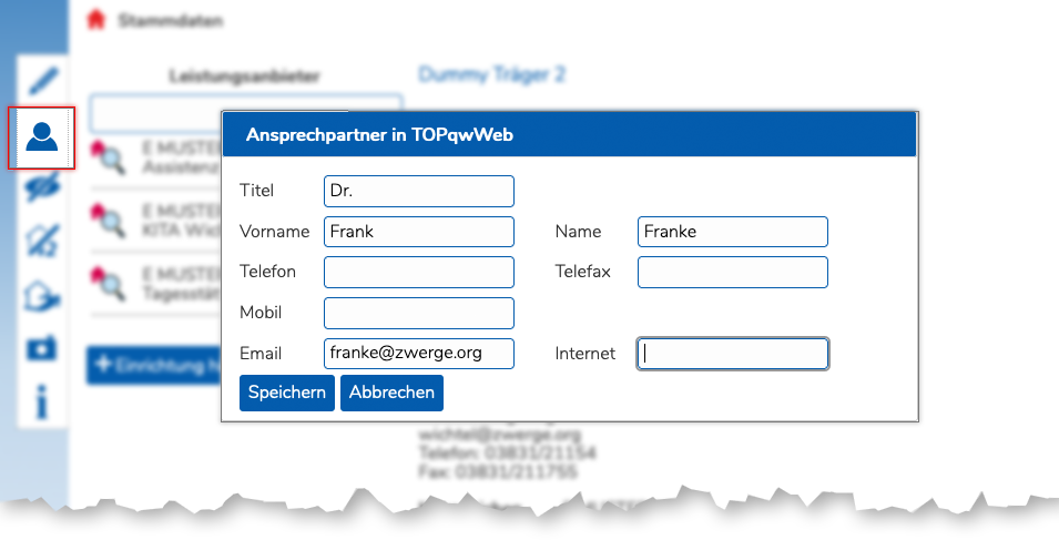 Die Kontaktdaten des Leistungserbringers können geändert oder eingegeben werden. Aiuch diese Daten können auf Wunsch beim Abgleich nach TOPqw übernommen werden.