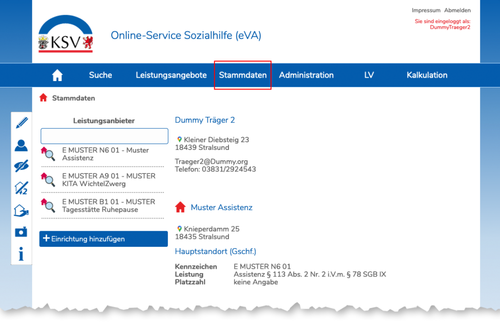 Unter dem Menüpunkt Stammdaten sind die diesem Leistungsanbieter zugeordneten Leistungsangebote sichtbar.